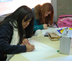 Isabel Banal presenta el motivo sobre el que reflexionarán a lo largo de la residencia: la carga. Los estudiantes comienzan dibujando lo que les inspira este concepto y después investigan figuras cargadas en revistas y periódicos.